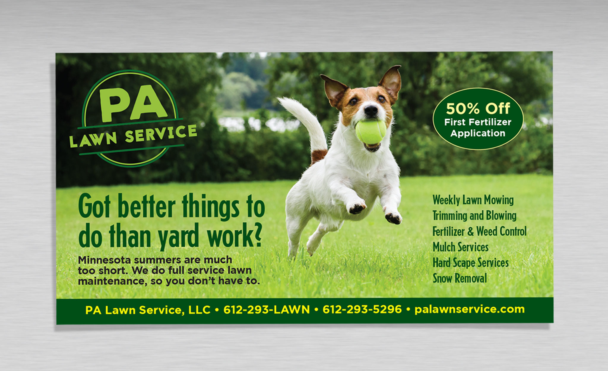 These two postcards for a lawn service company in Plymouth, MN use typical Minnesota backyard imagery to get target customers interested. They also serve as 1/2 page ads and as inserts into coupon mailer packs.